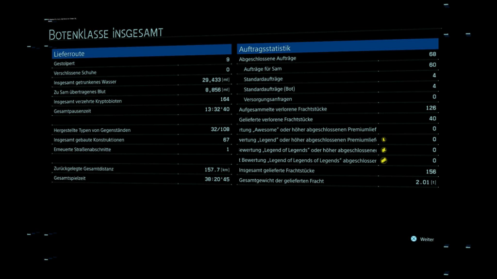 An Death Stranding bin ich komplett blind gegangen: ich wusste nicht, was mich erwarten würde. Ich kannte nur den Witz darüber, dass man ein Lieferant ist. Das Worldbuilding hat mich gleich überzeugt: eine gelungene mystische Apokalypse, Sci-Fi, Horror Mischung. Etwas naiv Amerika als Schauplatz zu wählen und die Geschichte darum zu spinnen, aber beides geht gut ineinander über. Man merkt, dass die Welt und die Begebenheiten so designed sind, dass das eigentliche Spiel „passieren“ kann. Im Laufe der Geschichte decken sich die Mysterien schrittweise auf, sogar noch bis nach den Credits. Die Cut-Scenes sind aufwendig gemacht. Die Charaktere sind glaubhaft und man lernt sie kennen und mögen. Typisch für japanische Spiele ist der philosophische Aspekt immer vertreten. Tatsächlich ist das Gameplay ausliefern und man stellt sich die Frage: kann man das für ca. 40h interessant gestalten. Death Stranding schafft es: Es kommen immer neue Gameplay-Aspekte hinzu und Herausforderungen bleiben durch Umgebung, Bedingungen und Ausrüstungen spannend. Der Aspekt, dass man sich vor der Reise sinnvoll Ausrüsten muss, um vorbereitet zu sein, fand ich am besten, weil es mich an RPGs erinnert hat. Ein paar Situationen gab es, in dem man die Sandbox-Welt auf spaßige Weise genutzt hat und Grenzen ausprobiert hat. Jede Lieferung war ein Abschnitt, den man sich wie Missionen gut einteilen konnte. Etwas wiederholt sich das Spiel im Mittelteil, aber es war nicht nervig. Die Online-Funktionen habe ich kaum genutzt, weil ich mich nicht lange damit aufhalten wollte (z.B. Straßenbau). Ich glaube, dass Spiel hat noch mehr Gameplaytiefe, aber da ich nur die 40h darin verbringen wollte, habe ich nicht alles gemacht und erkundet.